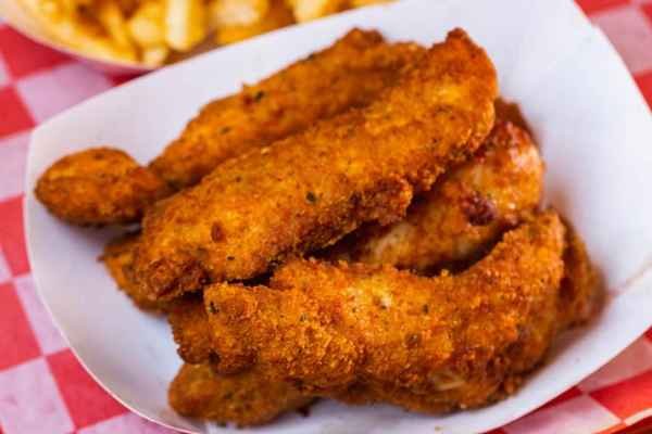 Chicken tenders are thin strips of juicy chicken coated in a crispy, deep fried breading and served hot.